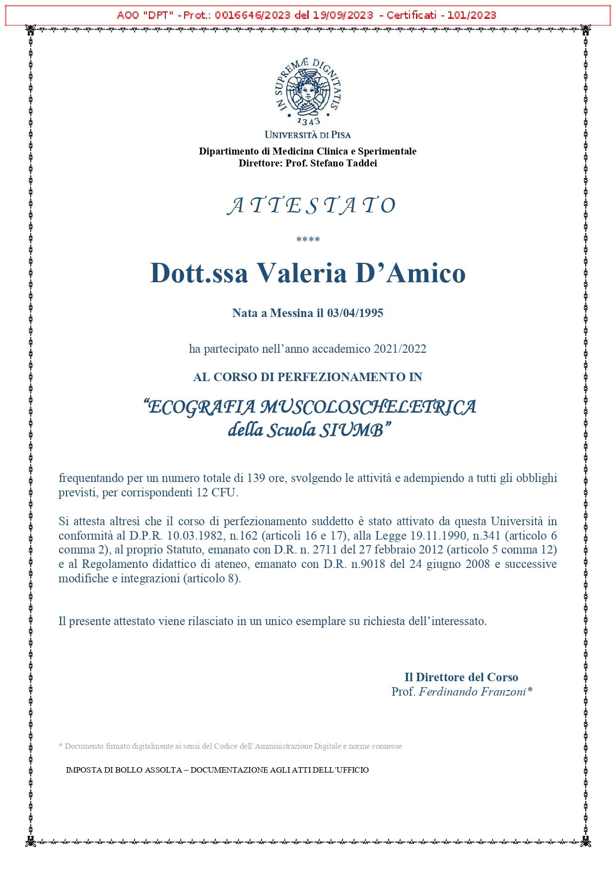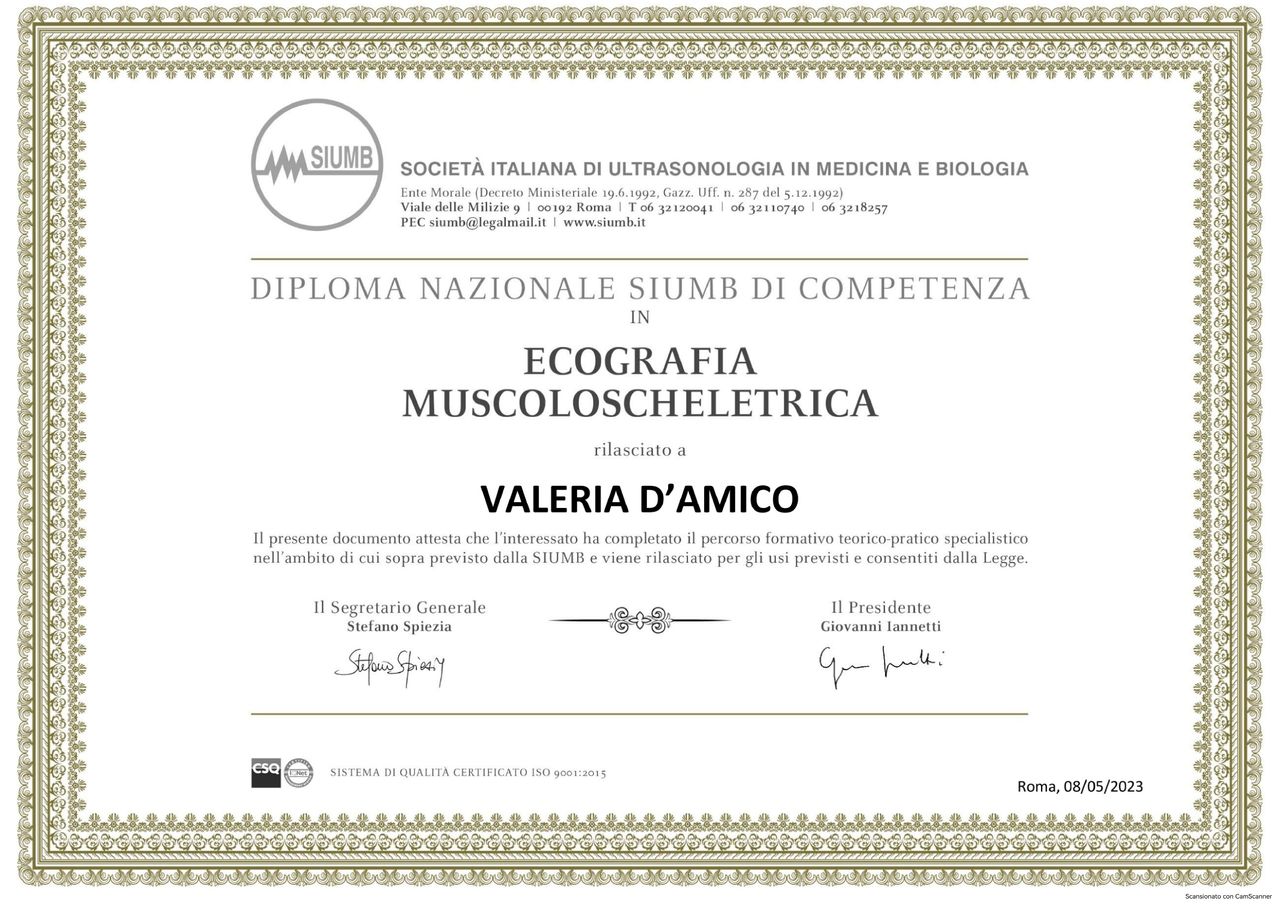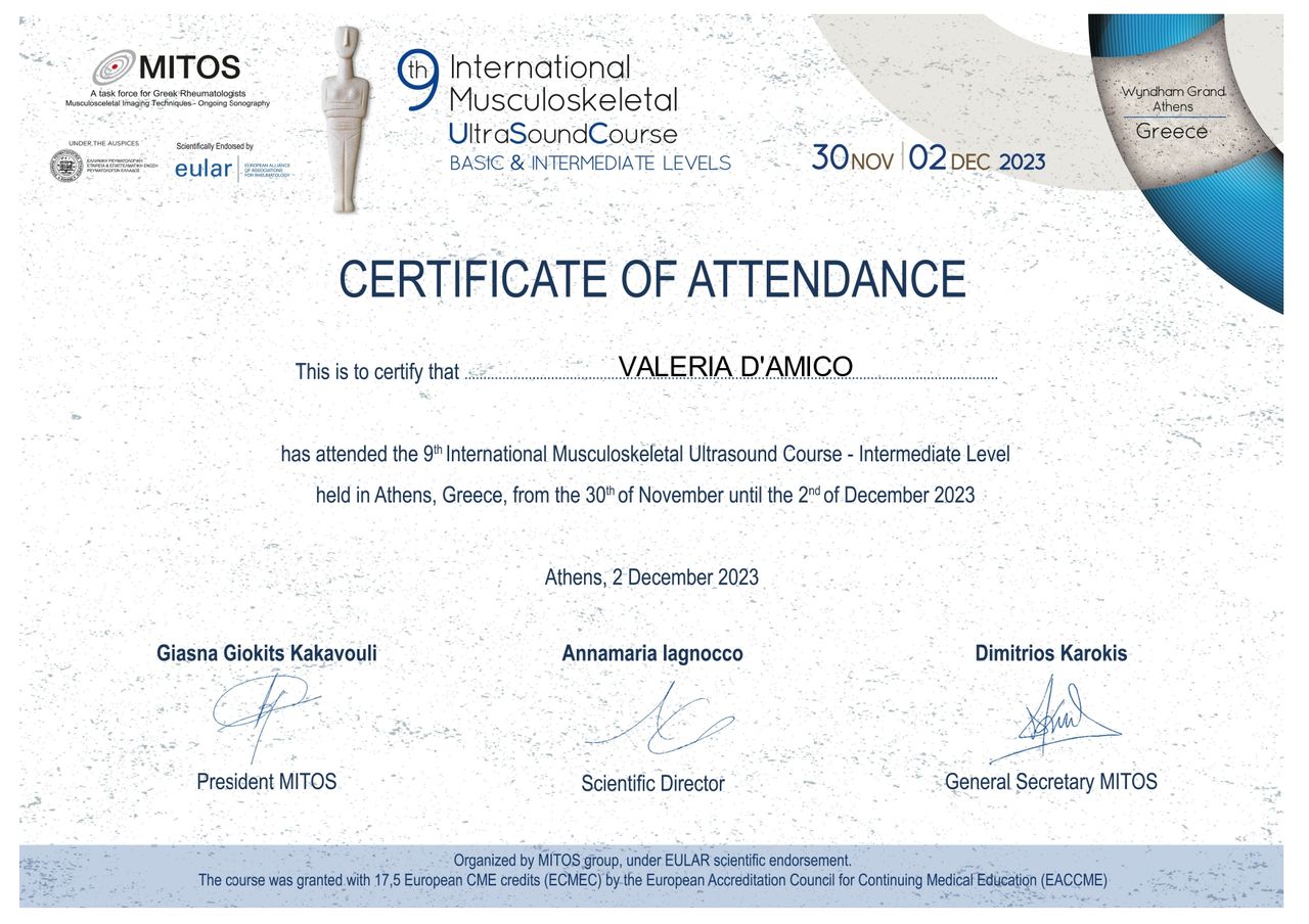Nel corso degli anni ho frequentato corsi avanzati di ecografia muscolo-scheletrica riconosciuti sia a livello europeo (EULAR) che italiano (SIUMB), conseguendo il diploma nazionale in ecografia muscolo-scheletrica.
